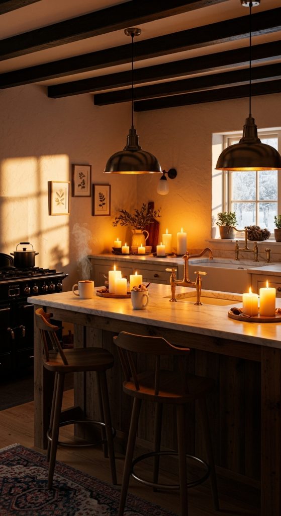 You can install pendant lights above your island or dining table for a soft glow, or add under-cabinet lighting to brighten up your countertops without overpowering the space. Candles are also a perfect addition — arrange them on open shelves or windowsills to bring in that flickering warmth that defines the winter season.