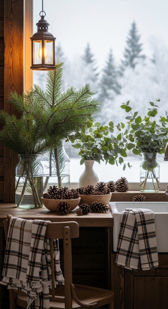 Winter decor is all about bringing nature indoors. You can achieve this by decorating your kitchen with pine branches, evergreen wreaths, or sprigs of eucalyptus in simple vases. These natural touches not only look beautiful but also fill your kitchen with a fresh, woodsy aroma that feels comforting.