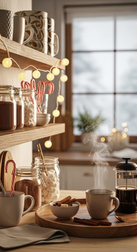 Use a small countertop area or a rolling cart to display your essentials — mugs, coffee beans, hot chocolate mix, marshmallows, cinnamon sticks, and flavored syrups. Add a small jar of candy canes or cookies for a fun and festive touch.