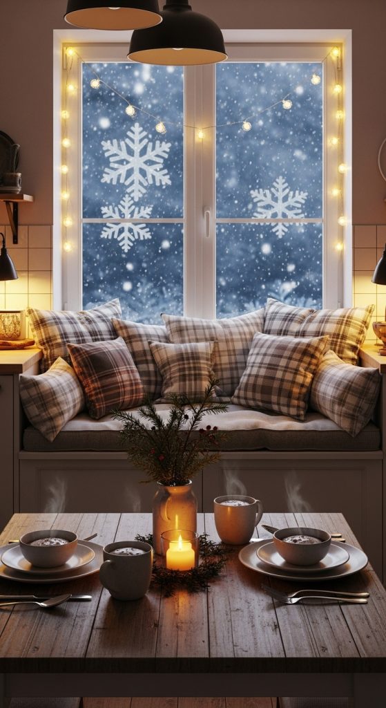 Add a few throw pillows in flannel or wool fabric for extra comfort. If your dining table is near a window, hang fairy lights or soft string lighting around the frame to give it a magical glow in the evenings.