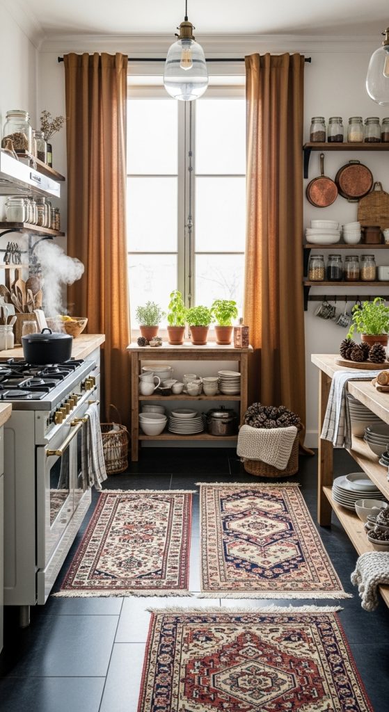 A woven rug in front of the sink adds both comfort and warmth underfoot, especially when the floors are cold. For open shelving, display folded linens in plaid or tartan patterns to introduce a seasonal touch without clutter.