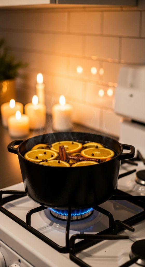 You can simmer a pot of water on the stove with sliced oranges, cloves, and cinnamon sticks for a natural fragrance that fills your home. Alternatively, use soy candles or diffusers with winter-inspired scents like cedarwood, vanilla bean, or gingerbread.