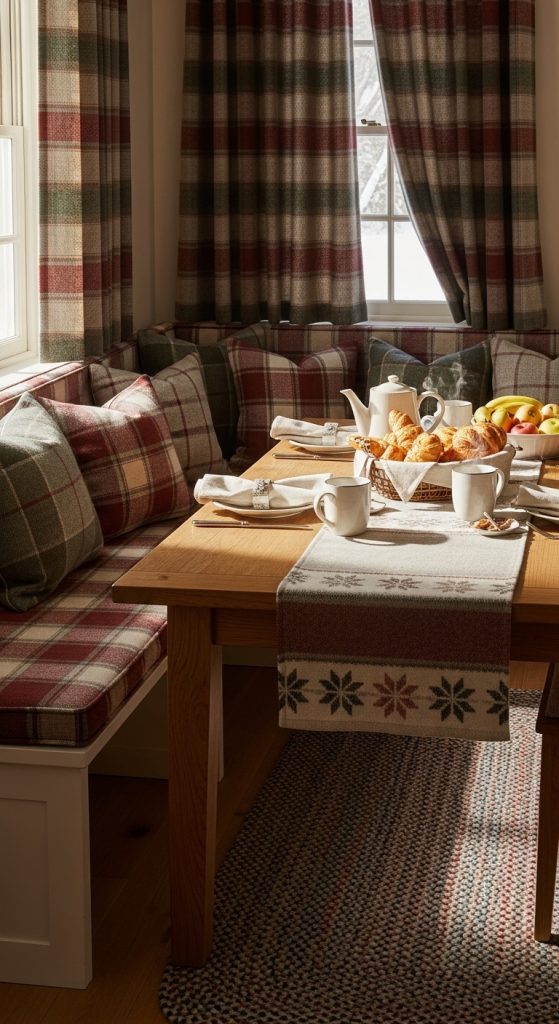 If you have a breakfast nook or dining area, layer it with a soft table runner, textured napkins, and upholstered seating. Adding curtains or fabric blinds in warm tones also helps insulate the room and enhance the winter atmosphere.