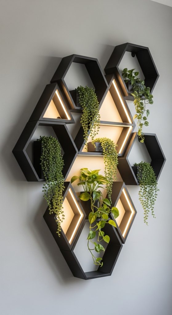 For a bold and modern statement, geometric wall shelves are an excellent choice. Think honeycomb-inspired hexagons, triangular shelves, or diamond-shaped arrangements. By attaching slim LED grow light panels inside or behind these geometric frames, you create both a light source and an artistic installation.