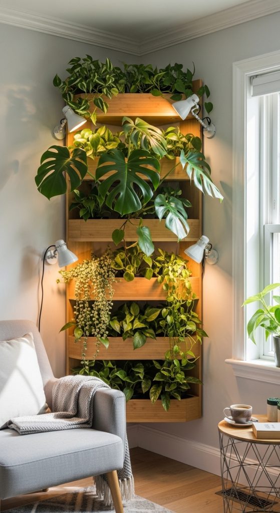 This system works well for mixing plant sizes, from small succulents to larger leafy plants. It also gives you the freedom to rearrange plants whenever you like. Wall-mounted grid shelves with grow lights can act as a dynamic piece of living wall art that evolves over time.