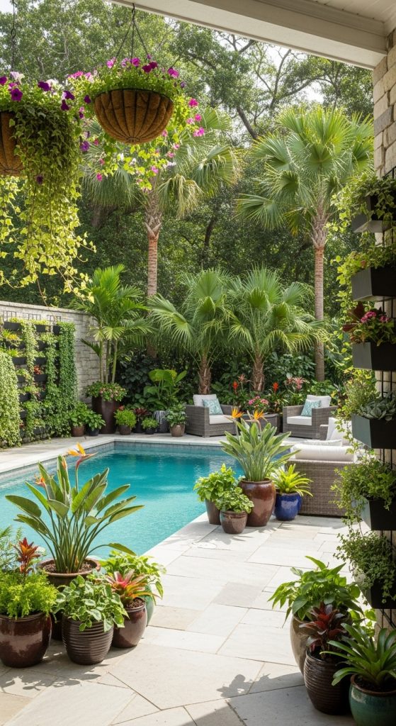 For a tropical look, add large leafy plants like banana trees or bird-of-paradise near the poolside. Their lush appearance instantly transforms your backyard into a serene paradise.