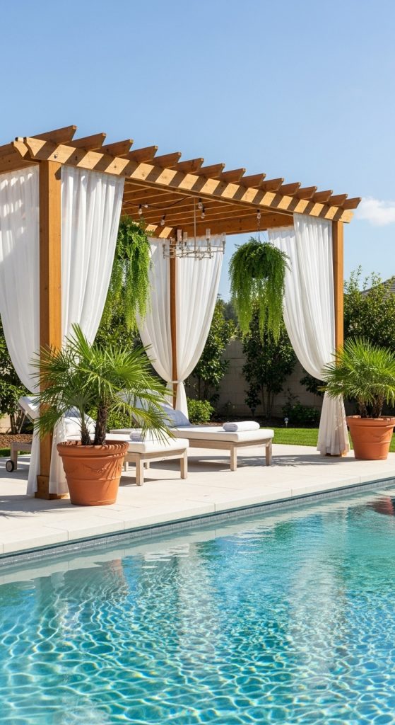 For a touch of luxury, consider a cabana with curtains and lounge seating. It creates a resort-like vibe, offering a perfect escape from the sun while still being close to the pool.
