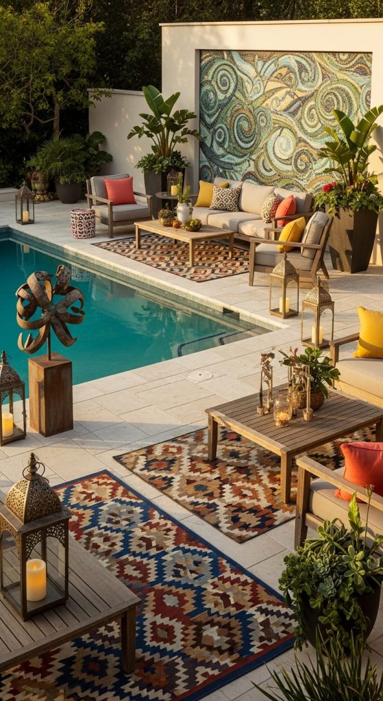 Add colorful outdoor rugs, patterned cushions, and art pieces designed for exterior use. Use stylish trays, candles, and lanterns to make your patio look curated yet effortless.