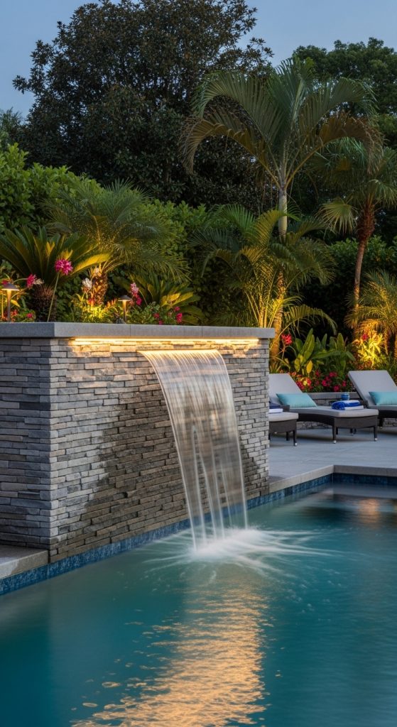 A cascading water wall can be built into the side of the pool or as a standalone feature nearby. The soothing sound of flowing water adds relaxation and masks background noise.