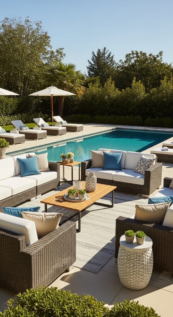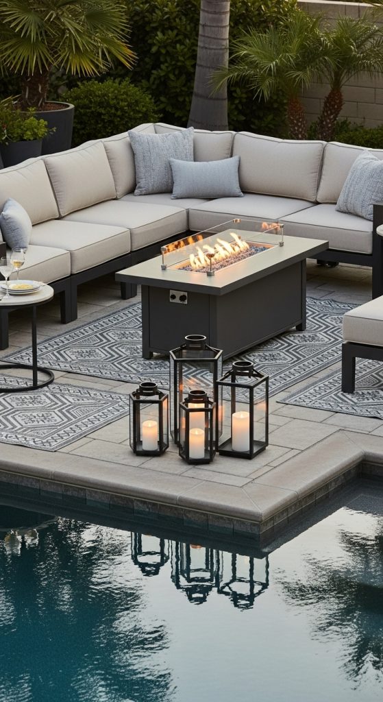 Add small details like side tables for drinks, decorative lanterns, and potted plants for an elevated yet cozy feel. A lounge area with a well-balanced mix of furniture and decor makes your pool patio both stylish and functional.