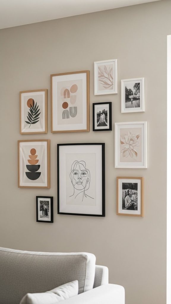 You can create a gallery wall using family photos, artwork, prints, or inspirational quotes. Mix different frame sizes and styles for a curated look.