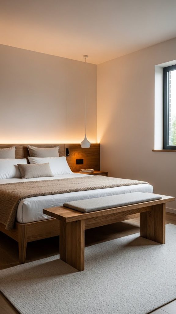 A wooden bench at the foot of the bed provides seating and a place to lay out clothes. A simple accent chair in a corner creates a cozy reading spot. Choose designs with clean lines and neutral upholstery.
