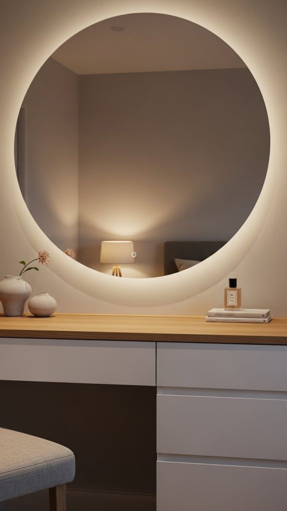 A round or rectangular mirror without heavy frames complements the simplicity. Wall mounted mirrors save space and enhance light reflection.