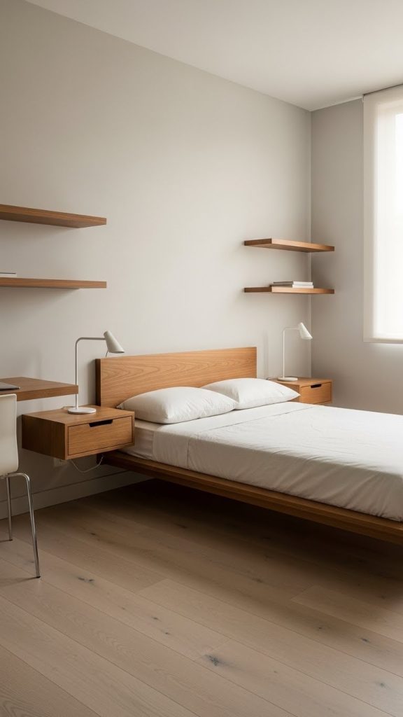 A wall mounted study table or vanity with a simple mirror is perfect for modern bedrooms. Floating shelves above the bed or beside the wardrobe provide storage while maintaining a light and open feel.
