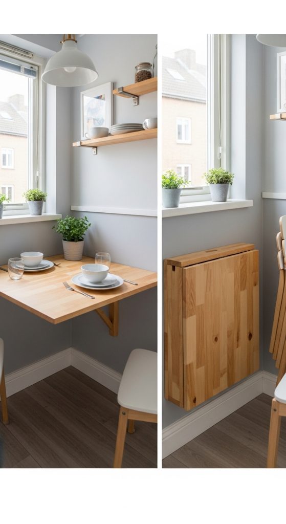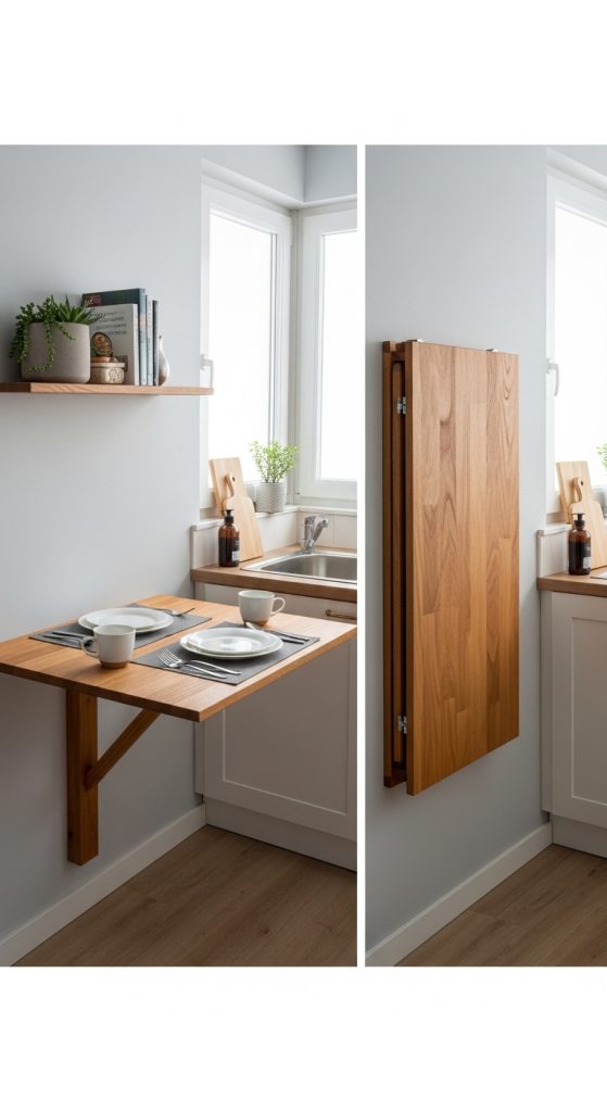 You can create a foldable table using hinges and a simple wooden surface. Add collapsible legs or a support bracket underneath. When folded, the table sits flat against the wall and barely takes up any space.