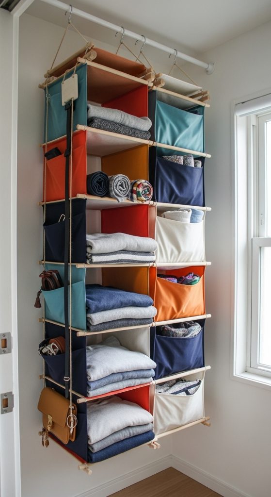 Small rooms often lack closet space, but a DIY hanging organizer can solve that issue quickly. You can make one using fabric, wood dowels, rope, macrame cord, or even metal rods.