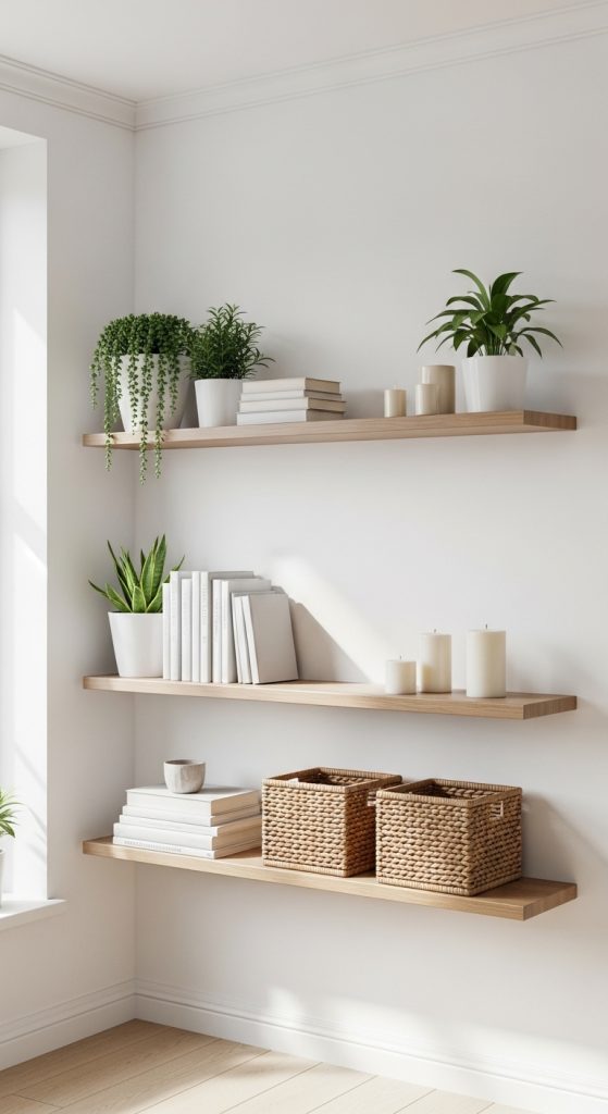 Floating shelves allow you to play with styling as well. You can keep them minimal with simple objects or turn them into a gallery of curated pieces. Either way, they make small rooms far more practical.
