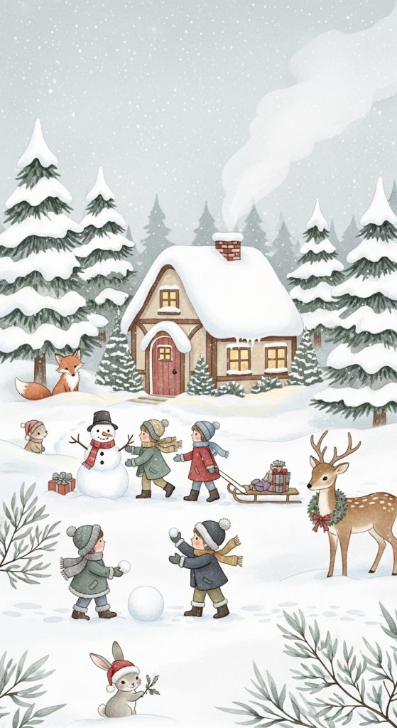 Illustrated holiday scenes in muted tones can create a cozy, storybook vibe. Think scenes of small cottages in snow, children playing in a winter landscape, or animals in festive settings.