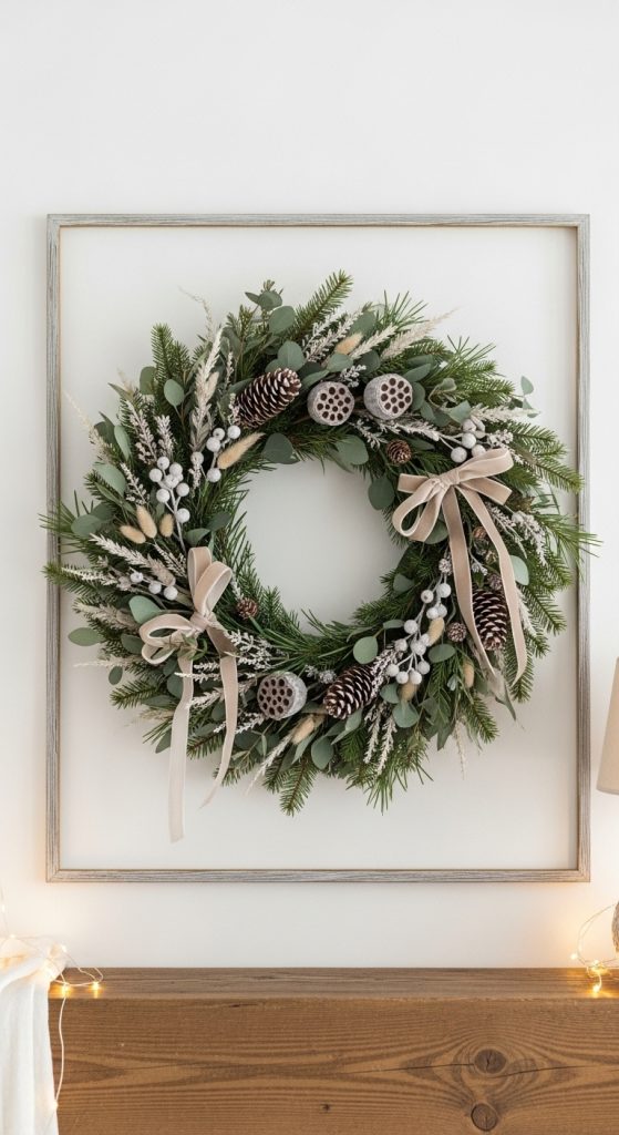 Wreaths are a classic Christmas decoration, but for a soft wall art approach, consider prints or paintings of neutral-colored wreaths. Greenery mixed with muted tones like cream, taupe, or soft gray looks elegant and understated.