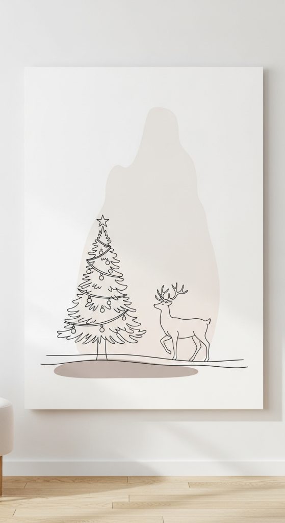 Less is often more when it comes to modern holiday decor. Minimalist line drawings of Christmas trees, reindeer, or angels provide a soft, sophisticated look. These simple sketches often use black, white, or soft pastel backgrounds, keeping the artwork subtle yet festive.