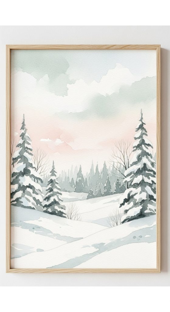 Consider prints of winter landscapes, snow-covered trees, or simple Christmas motifs like stars, wreaths, or ornaments in pastel shades. Muted tones such as soft blush, sage green, and icy blue work beautifully. These prints can be framed in white or light wood frames for an airy, elegant look.