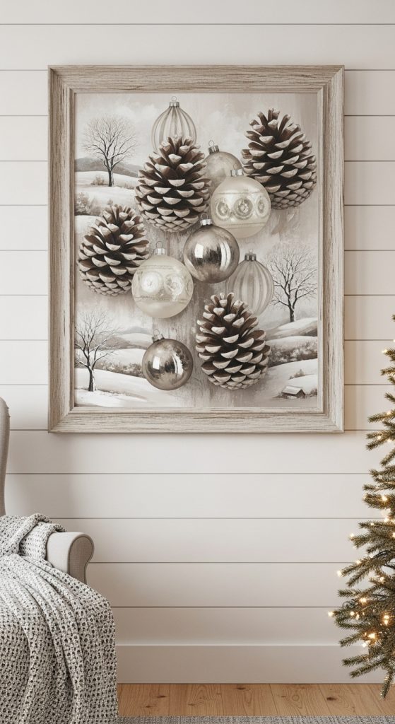 Farmhouse style is synonymous with warmth and comfort, and soft Christmas wall art complements this aesthetic perfectly. Think neutral tones like cream, beige, and soft brown with rustic imagery such as pinecones, barns in the snow, or vintage Christmas ornaments.