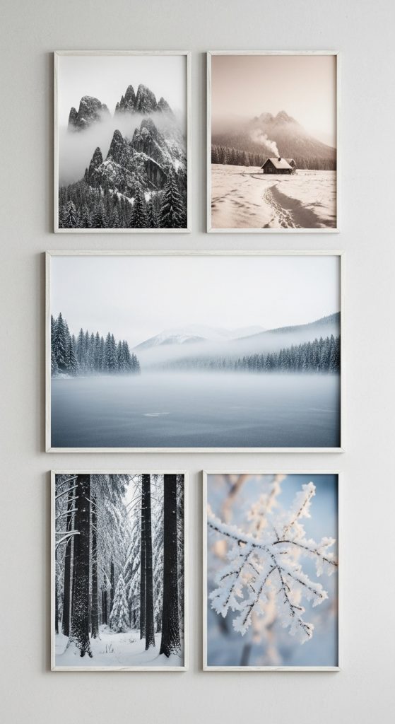 Soft, muted photography of winter landscapes can double as holiday wall art. Snowy forests, foggy mountains, or quiet frozen lakes in pastel or monochrome tones create a peaceful seasonal atmosphere.