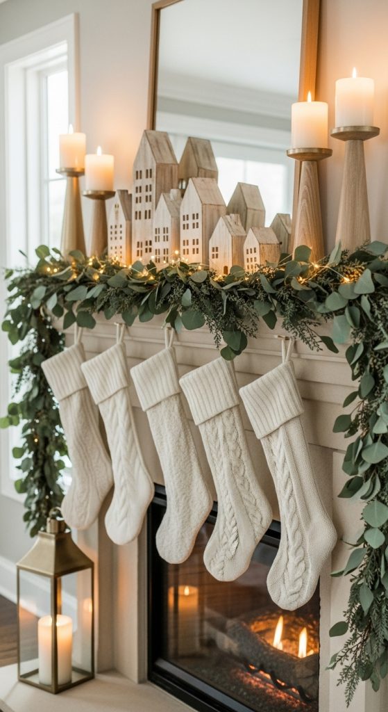 Choose a faux eucalyptus garland or one made of muted foliage. Add soft gold or wooden candle holders. Incorporate warm white lights for a gentle glow. Keep your mantel uncluttered, focusing on balance and softness.