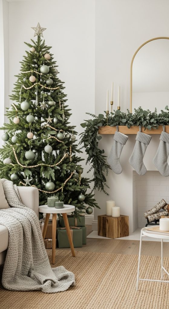 Dress your tree with matte sage ornaments, frosty eucalyptus stems, and wooden beads. Choose wrapping paper in pale sage, soft gray, or kraft brown to maintain the muted palette. Add textured blankets in soft green and ivory. Instead of a typical red and green wreath, craft a sage centered wreath using eucalyptus, lambs ear, and soft greenery.