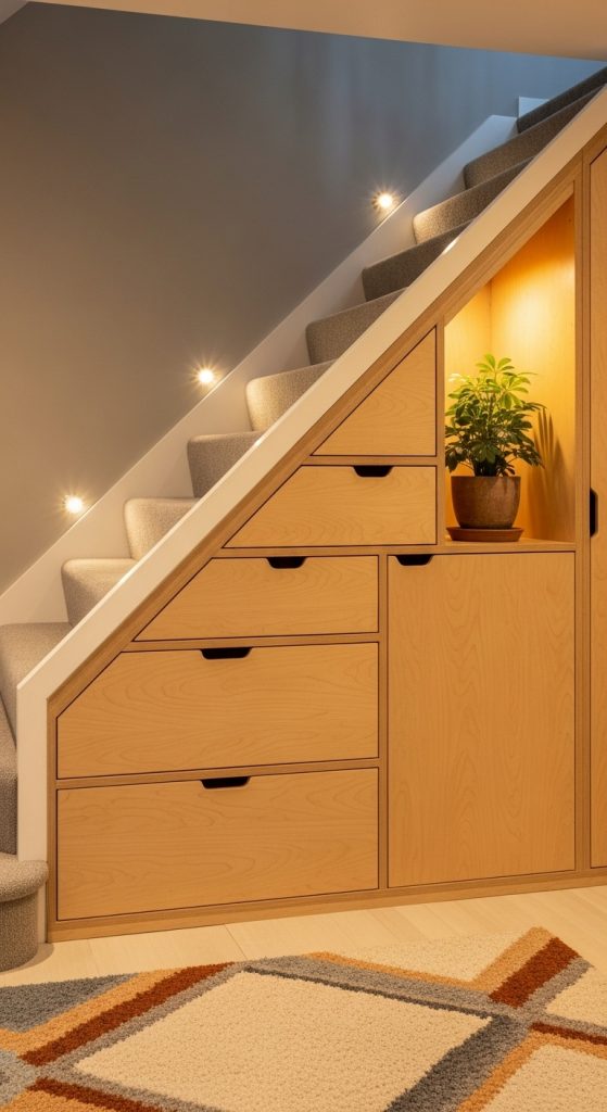 Every home has small nooks or awkward spaces that can be turned into functional storage zones. For example, the area under the stairs can become a mini closet, reading nook, or shelving unit.