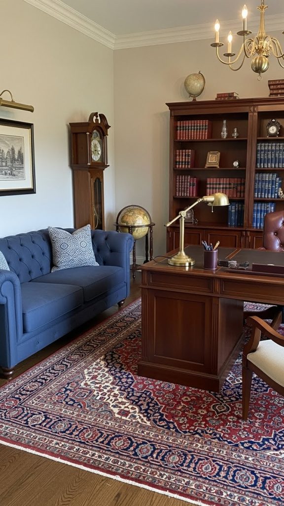 Visual Inspiration: A navy blue tufted couch in front of a mahogany desk, with matching bookshelves and a Persian-style rug, creates a distinguished and inviting workspace.