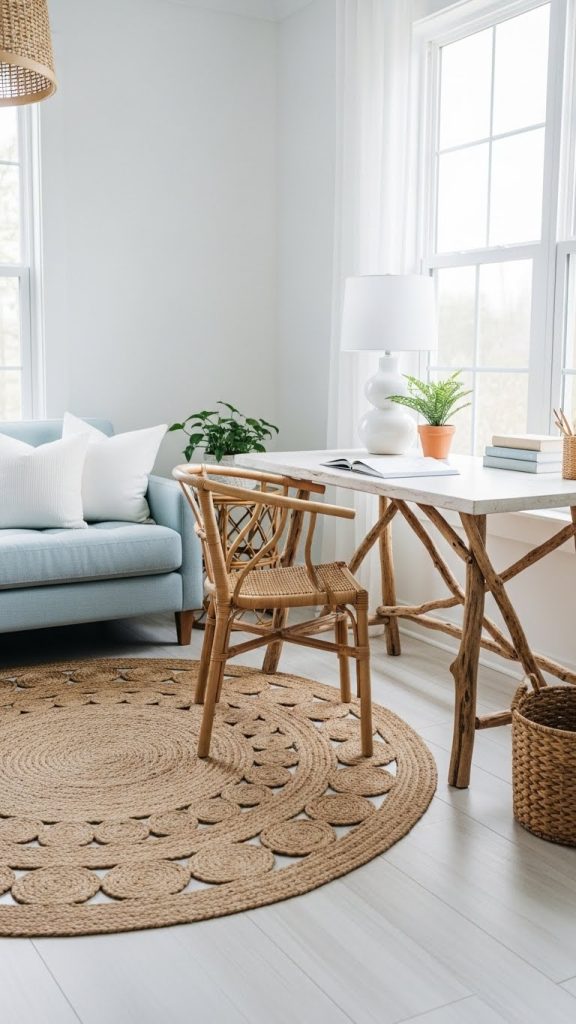 Visual Inspiration: A pale blue couch against white walls with a driftwood desk and a jute rug evokes a serene, coastal retreat ideal for productivity and relaxation.