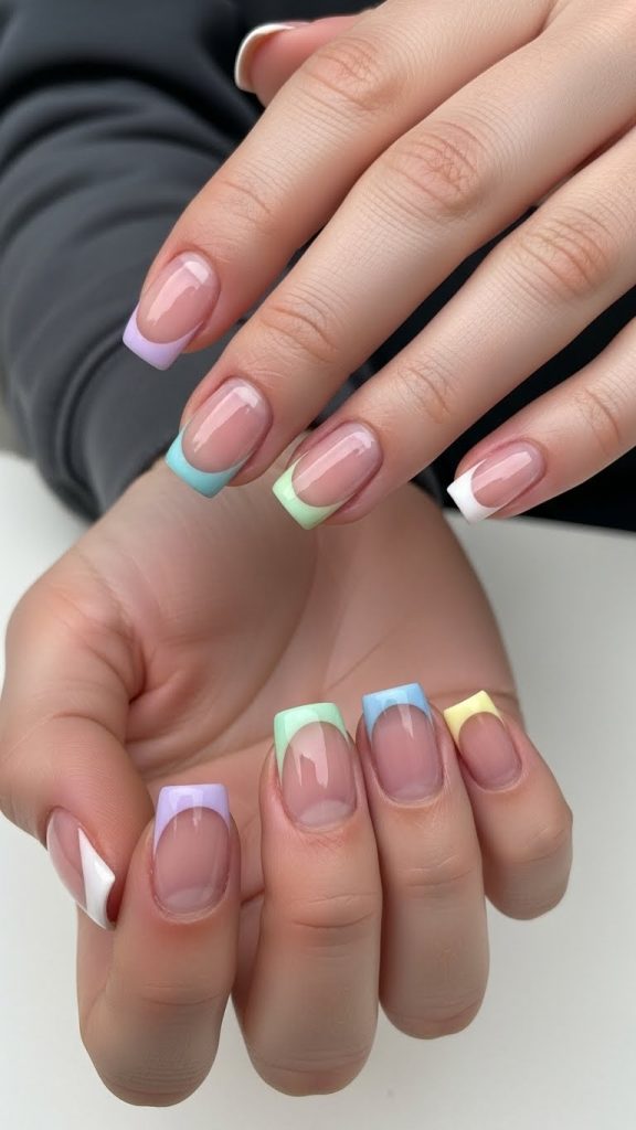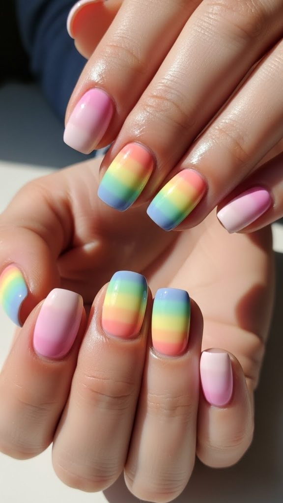 Another fun option is rainbow tips or rainbow stripes on a neutral base. This design celebrates creativity and individuality and is perfect for summer vacations or fun outings.
