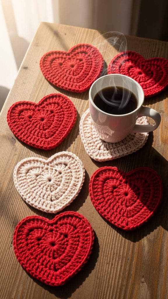 Crochet heart coasters are one of the most popular Valentines crochet ideas because they are quick easy and functional. These coasters are perfect for beginners and can be made in a variety of colors.