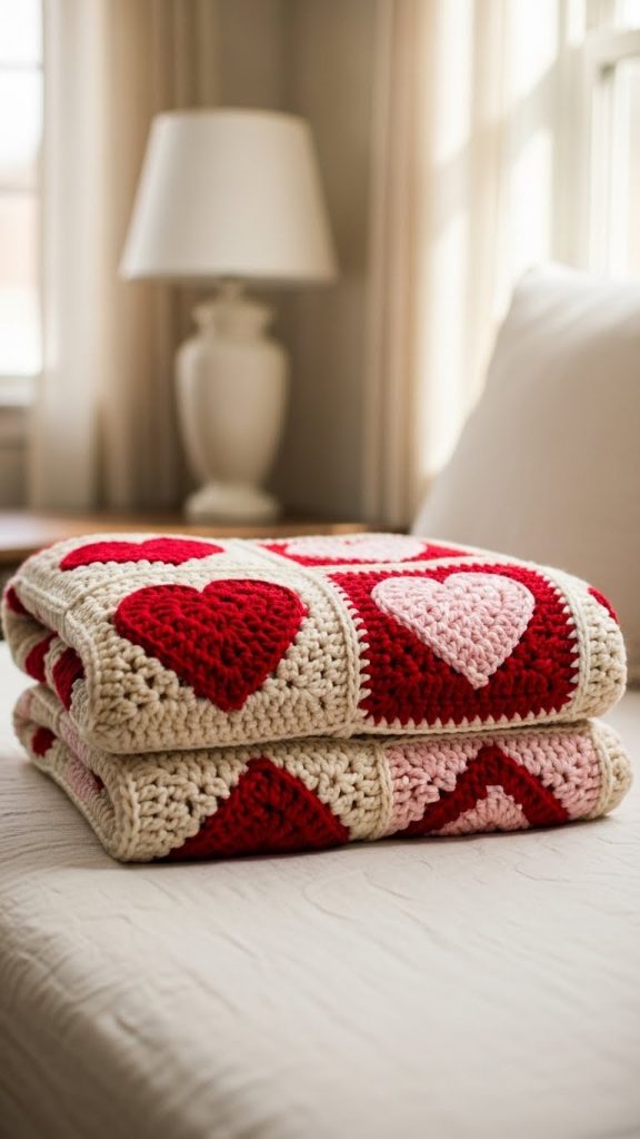 A crochet Valentines blanket is a meaningful long term project that makes a beautiful keepsake gift. You can crochet heart motifs squares or repeating patterns throughout the blanket.