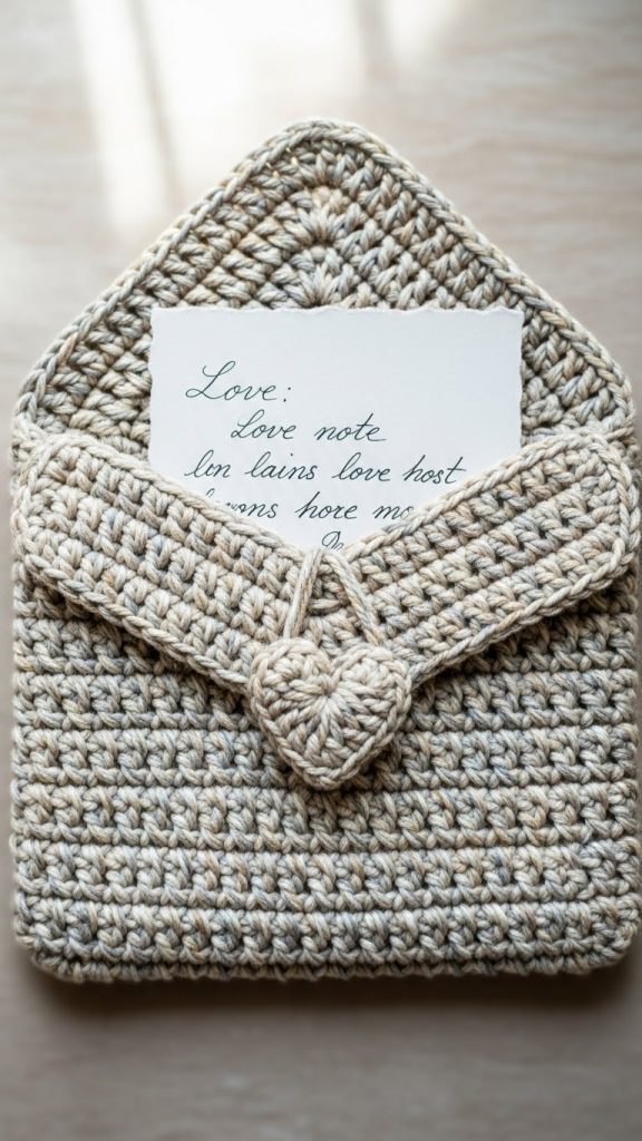 You can crochet a simple rectangle fold it into an envelope shape and add a heart button or tie closure. Choose yarn colors that complement the message inside.