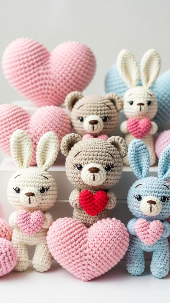 Amigurumi crochet plushies are adorable meaningful and perfect for Valentines Day. You can create hearts bears bunnies cats or even small dolls holding hearts.