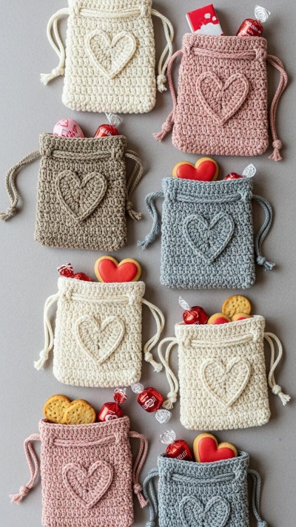 Crochet gift bags are reusable eco friendly and charming. You can crochet small drawstring bags or open top pouches decorated with hearts or textured stitches.