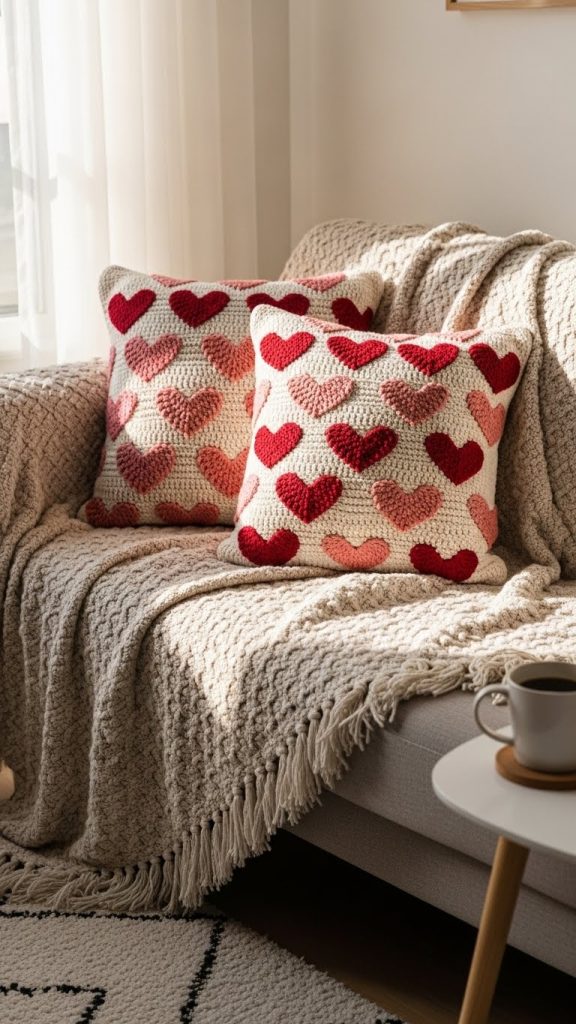 Choose soft yarns like acrylic cotton blends or chunky yarn for extra comfort. Neutral pillow covers with subtle heart details are perfect for minimalist homes while bold red and pink designs create a festive atmosphere.