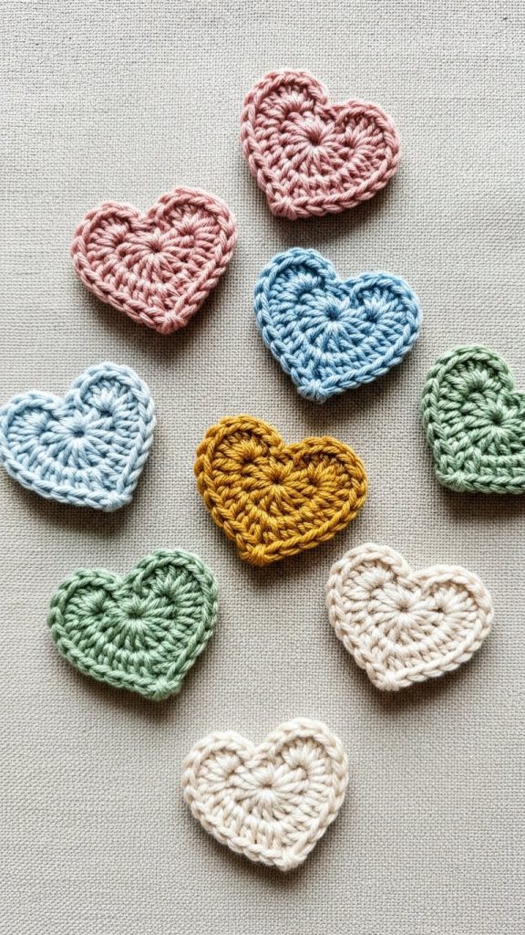 Crochet heart appliques are versatile and can be used in many creative ways. These small hearts can be sewn onto hats bags sweaters blankets or pillows.