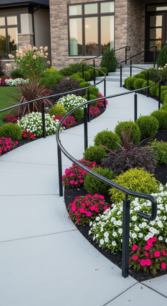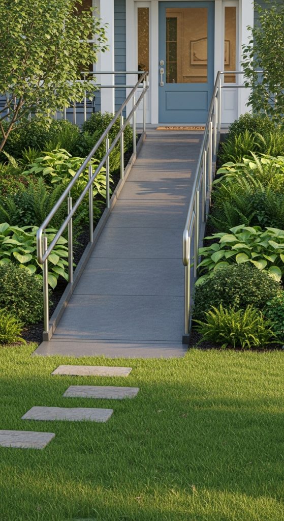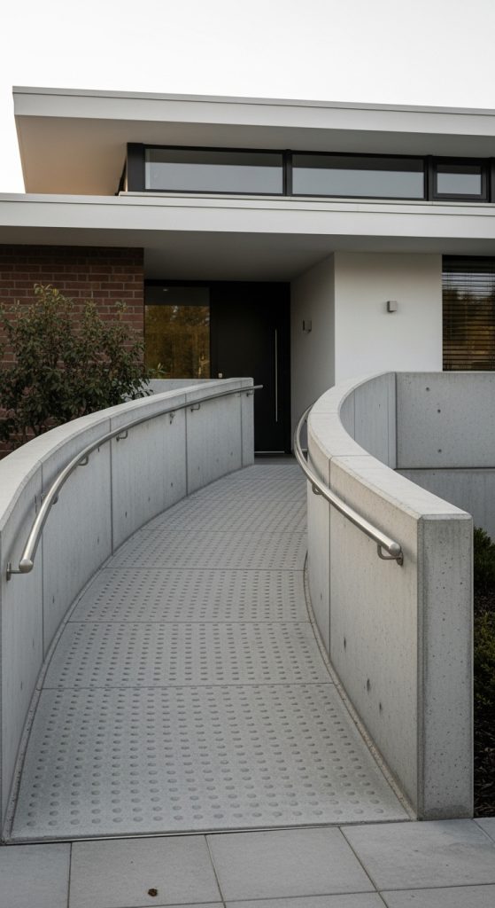 Design tip: Consider adding gentle curves or slopes to the concrete ramp to match the home’s architectural style.