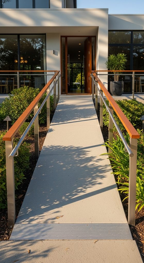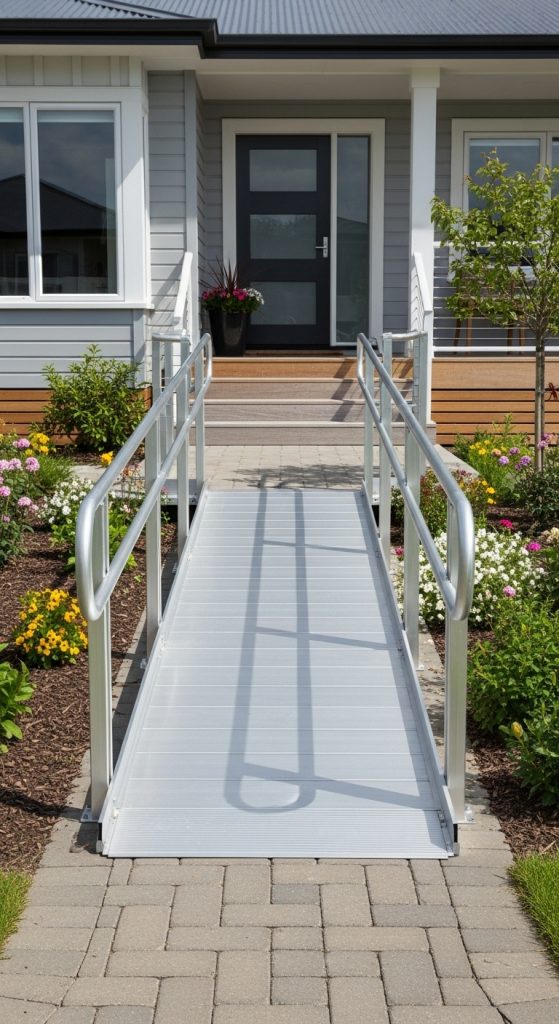 Design tip: Pair a sleek aluminum ramp with modern railing to blend functionality with aesthetic appeal.