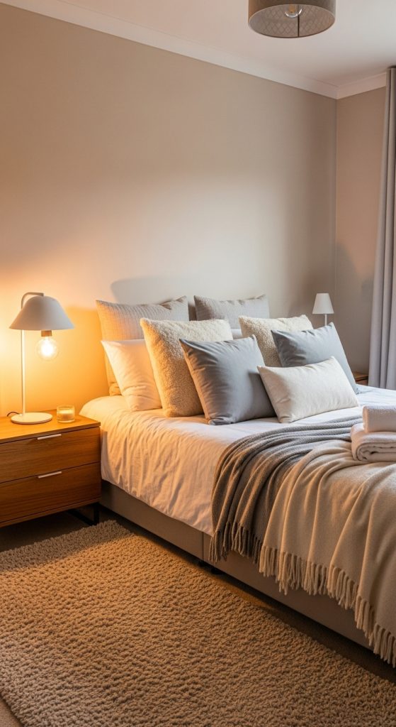 Choose calming colors like soft beige, pale blue, or muted green for the walls and textiles. Add a bedside lamp with warm lighting, a soft rug underfoot, and blackout curtains for restful sleep.