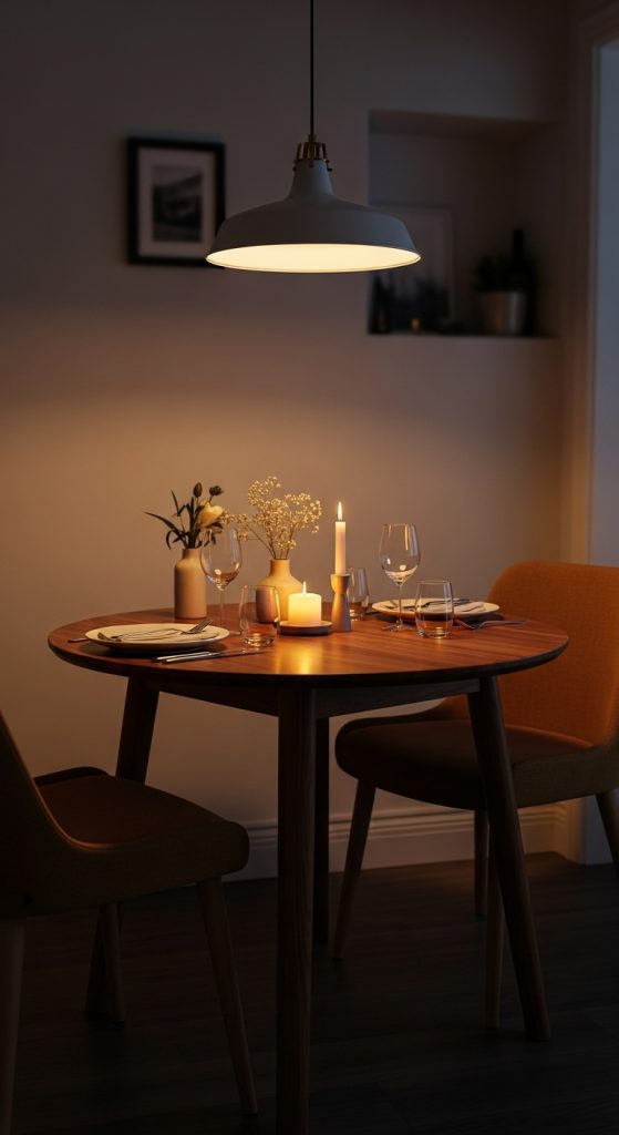 Lighting is key here as well. A pendant lamp hanging above the dining table or a cluster of candles creates a warm, intimate atmosphere. If space is tight, consider a wall-mounted foldable table or a bar-height counter with stools.