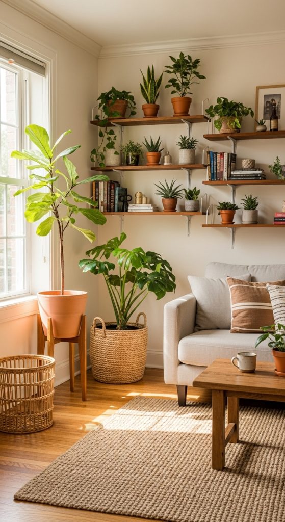 If you do not have a green thumb, there are plenty of low-maintenance plants like snake plants, pothos, or ZZ plants that thrive with minimal care. For an even cozier effect, use woven baskets or ceramic pots to style your plants.