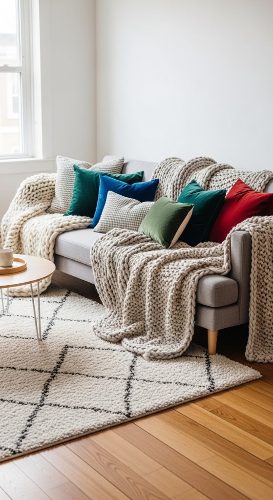Nothing says cozy like soft, layered fabrics. Blankets, throws, cushions, and rugs add both comfort and texture to your apartment. If your furniture feels a little too modern or minimal, draping a chunky knit throw or faux fur blanket over the sofa will instantly soften the look.