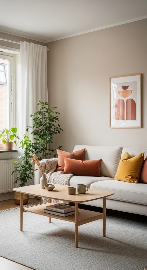 To prevent the apartment from feeling flat, introduce warm accent colors through textiles, décor, and accessories. Earthy tones such as terracotta, mustard yellow, olive green, or rust add warmth without overwhelming the space. If you love bold colors, incorporate them in small doses with throw pillows or artwork.