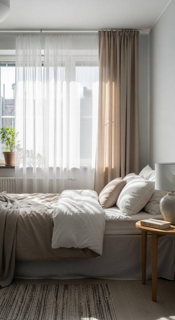 Choose light, flowy curtains that allow natural light to filter in while maintaining privacy. If you want a layered look, combine sheer curtains with heavier drapes. During the day, you can let the sunlight pour in, and at night, you can close the drapes for added warmth and coziness.