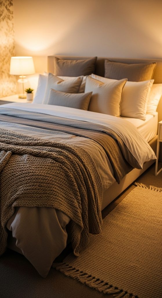 Start with high-quality bedding layered with soft duvets, blankets, and multiple pillows. Neutral tones with subtle accents create a calming environment perfect for sleep. Adding a textured throw at the foot of the bed enhances both comfort and style.