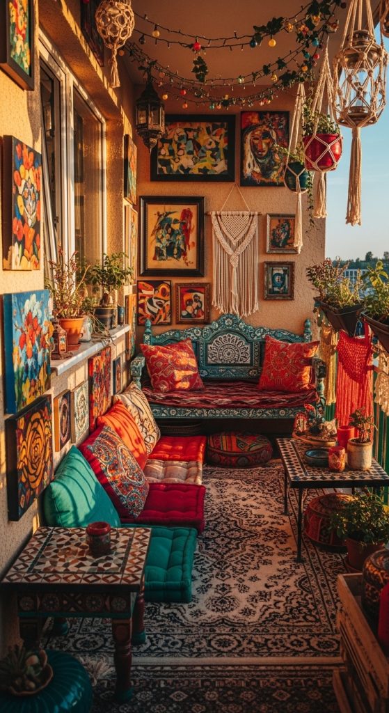 A bohemian-inspired balcony embraces warmth, comfort, and creativity. It features layered textiles, eclectic decor, and a relaxed, welcoming atmosphere.